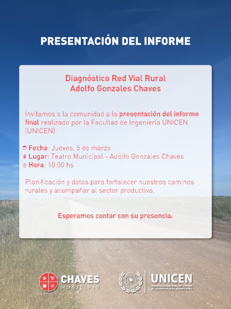 En el Teatro Municipal se llevó a cabo la presentación del diagnóstico de la Red Vial Rural del distrito, elaborado por la Facultad de Ingeniería de la UNICEN, con la participación de la intendenta municipal, funcionarios de gobierno, concejales, productores, integrantes de ASOPROCHA y público en general.