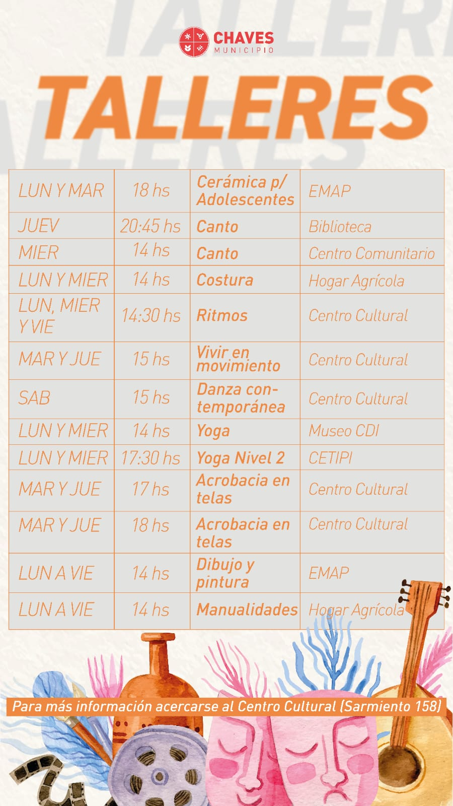 Para obtener más información sobre días, horarios y profesores a cargo de cada taller, se recomienda acercarse a la Dirección de Cultura o consultar los canales oficiales del Municipio.