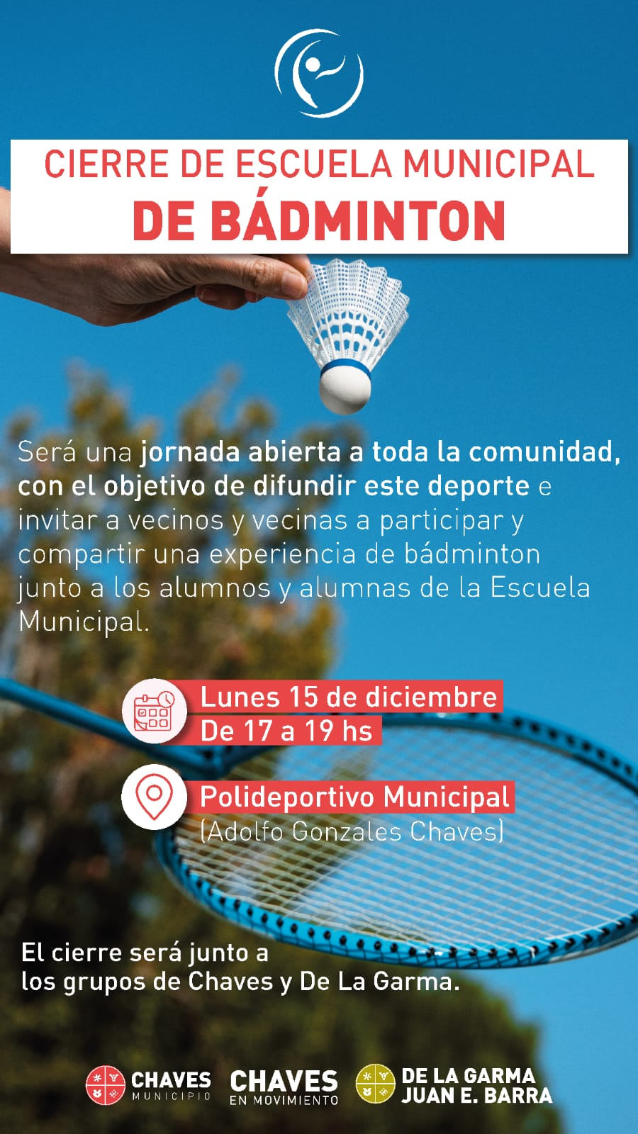 La Dirección de Deportes de Chaves Municipio invita a participar del cierre anual de la Escuela Municipal de Bádminton, que se llevará a cabo el lunes 15 de diciembre, de 17 a 19 horas, en el Polideportivo Municipal de Adolfo Gonzales Chaves.