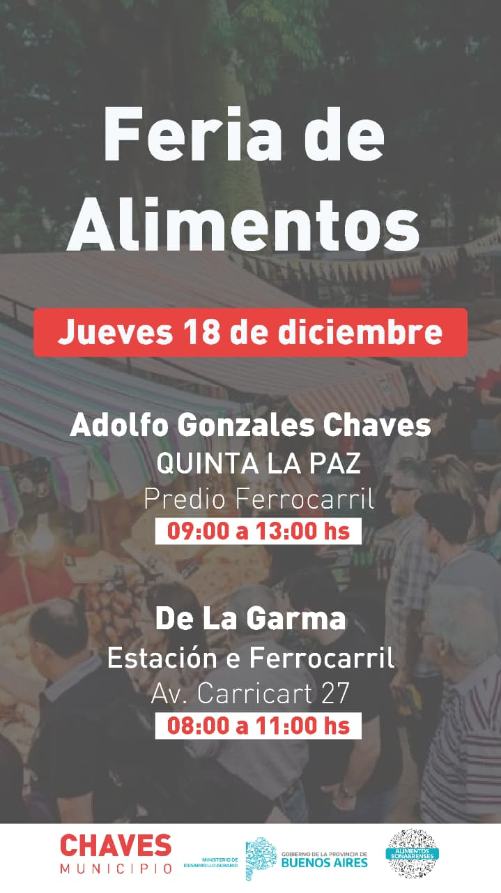 El próximo jueves 18 de diciembre, las localidades de Gonzales Chaves y De la Garma serán sede de una nueva edición de la Feria de Alimentos, una iniciativa impulsada por el programa Mercados Bonaerenses, que tiene como objetivo fomentar el consumo local, acercar alimentos de calidad a precios accesibles y fortalecer el trabajo de productores regionales.