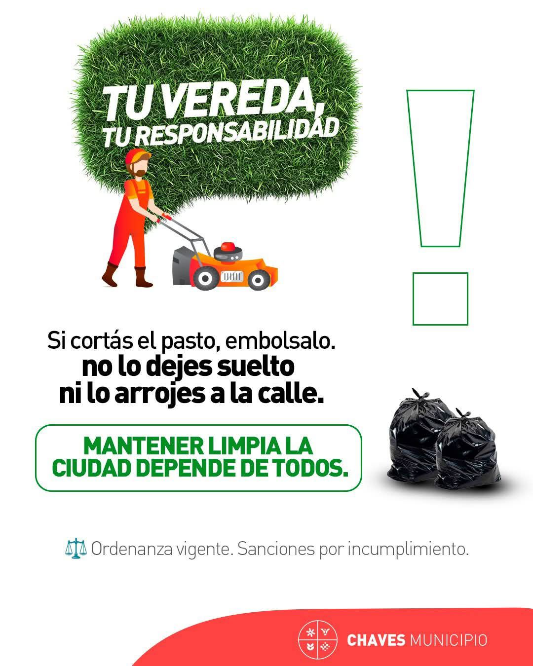 En ese marco, desde el Municipio se recuerda que el mantenimiento de las veredas es responsabilidad de cada frentista, de acuerdo a la ordenanza vigente. Al realizar el corte de pasto, el mismo debe ser embolsado correctamente, evitando dejarlo suelto o arrojarlo a la vía pública, ya que esto genera obstrucciones, suciedad y problemas en el drenaje.