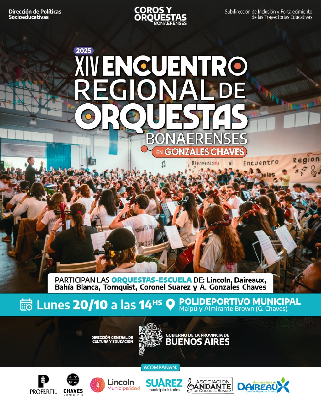 La Orquesta Escuela Chaves invita a toda la comunidad a disfrutar del XIV Encuentro Regional de Orquestas Bonaerenses, que se realizará el lunes 20 de octubre a las 14 horas en el Polideportivo Municipal, ubicado en Maipú y Almirante Brown.