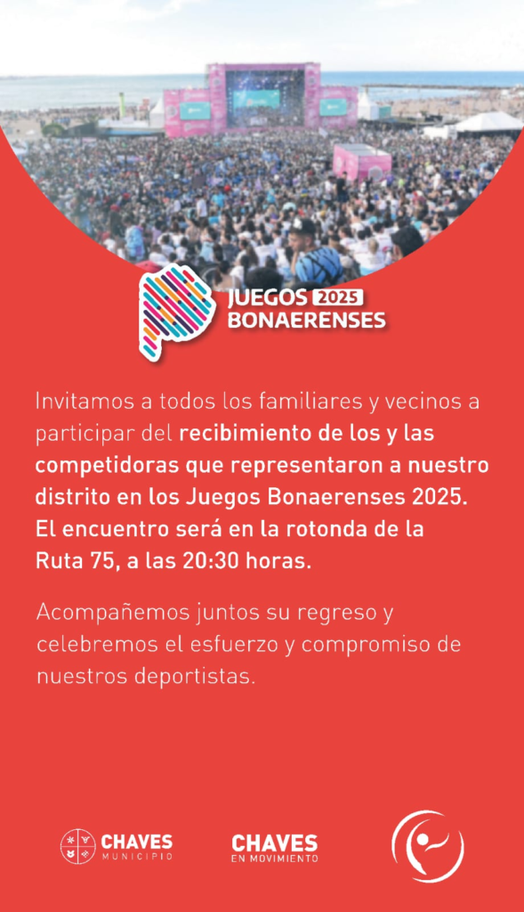 Chaves Municipio invita a familiares, amigos y vecinos a participar del recibimiento de los y las competidoras que representaron al distrito en los Juegos Bonaerenses 2025.