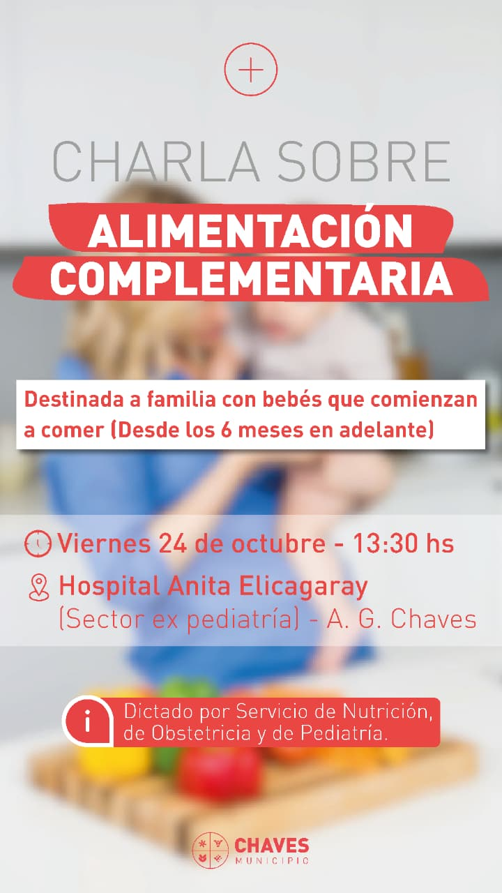La Secretaría de Salud de Chaves Municipio informa que la charla sobre Alimentación Complementaria, organizada por los servicios de Nutrición, Pediatría y Obstetricia, se realizará el viernes 24 de octubre a las 13:30 horas.