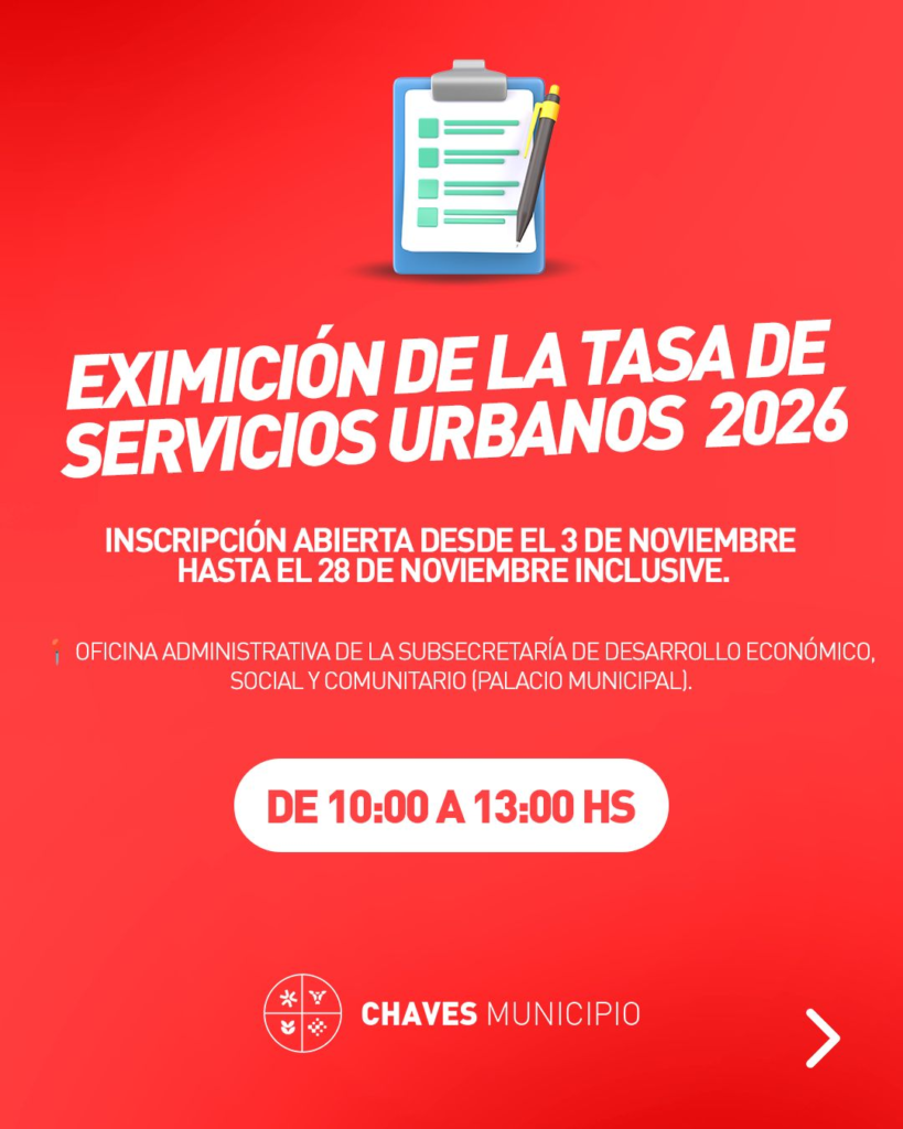 Chaves Municipio informa que desde el 3 hasta el 28 de noviembre inclusive estará abierta la inscripción para acceder a la eximición de la Tasa de Servicios Urbanos correspondiente al año 2026.