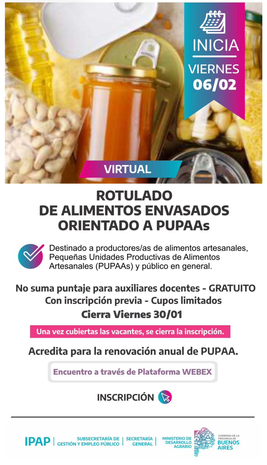 La Dirección de Producción de Chaves Municipio, con el apoyo del Ministerio de Desarrollo Agrario de la provincia de Buenos Aires, invita a productores y productoras, así como a las Pequeñas Unidades Productivas de Alimentos Artesanales (PUPAAs) habilitadas o en trámite, a participar de la Capacitación de Rotulado de Alimentos Envasados orientada a PUPAAs.