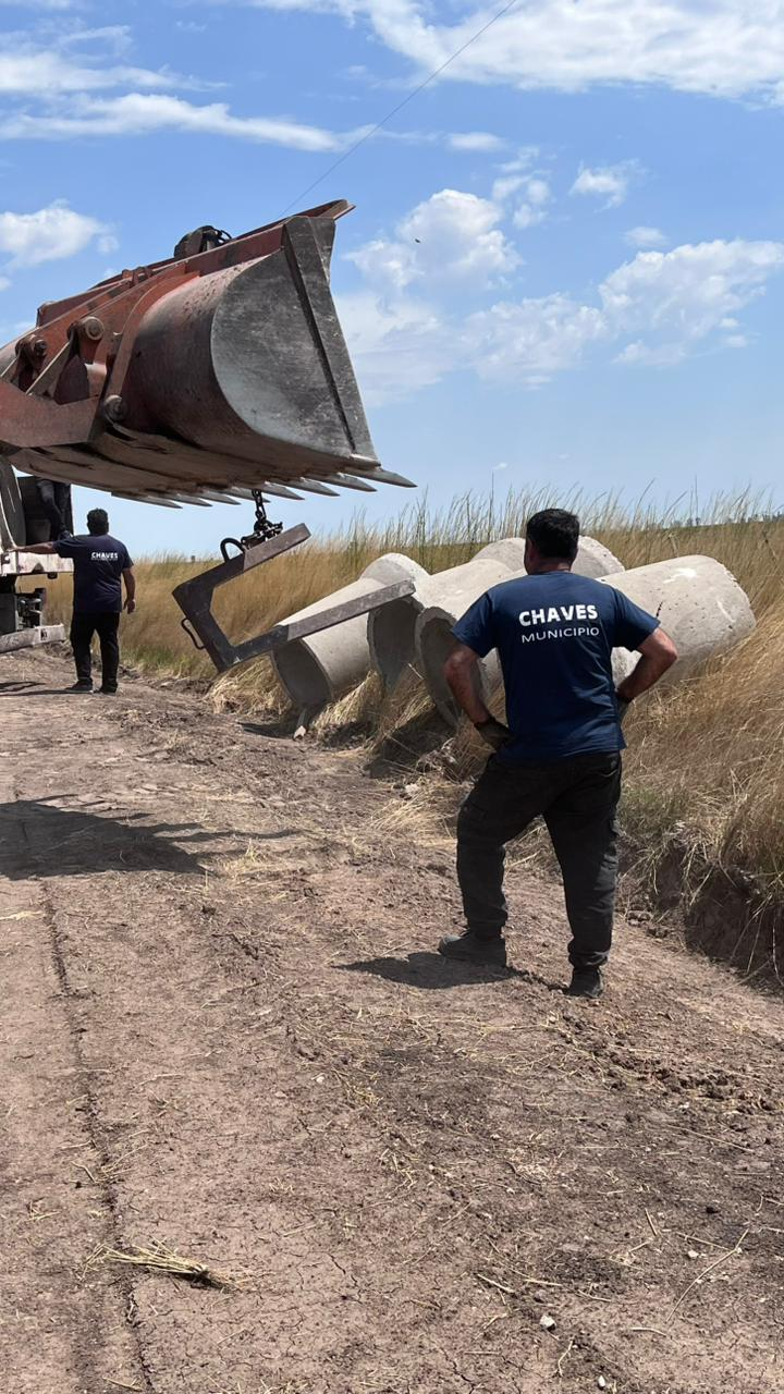 Chaves Municipio avanza con la colocación de 60 tubos que serán distribuidos en cinco puntos estratégicos de la zona del Cuartel 13, en el límite con Coronel Pringles, con el objetivo de mejorar la circulación y el estado de los caminos rurales.