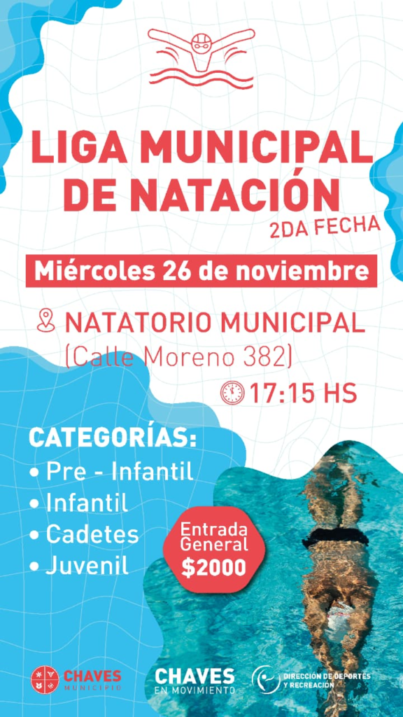La Dirección de Deportes y Recreación de Chaves Municipio informa que este miércoles 26 de noviembre se llevará a cabo la segunda fecha de la Liga Municipal de Natación, un evento que reúne a jóvenes nadadores y nadadoras de todo el distrito en una jornada de competencia, aprendizaje y disfrute del deporte.