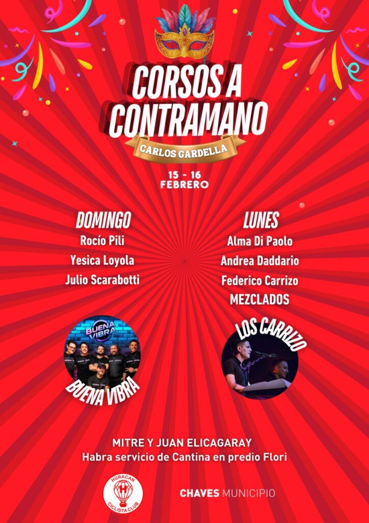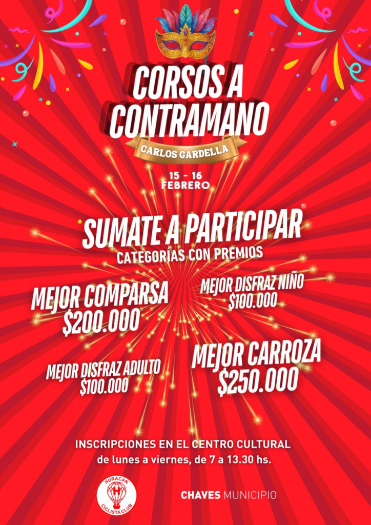 La Dirección de Cultura y Turismo de Chaves Municipio informó que los días 15 y 16 de febrero, a partir de las 20.30 horas, se llevarán a cabo los tradicionales Corsos a Contramano, organizados en conjunto con el Club Huracán Ciclista.