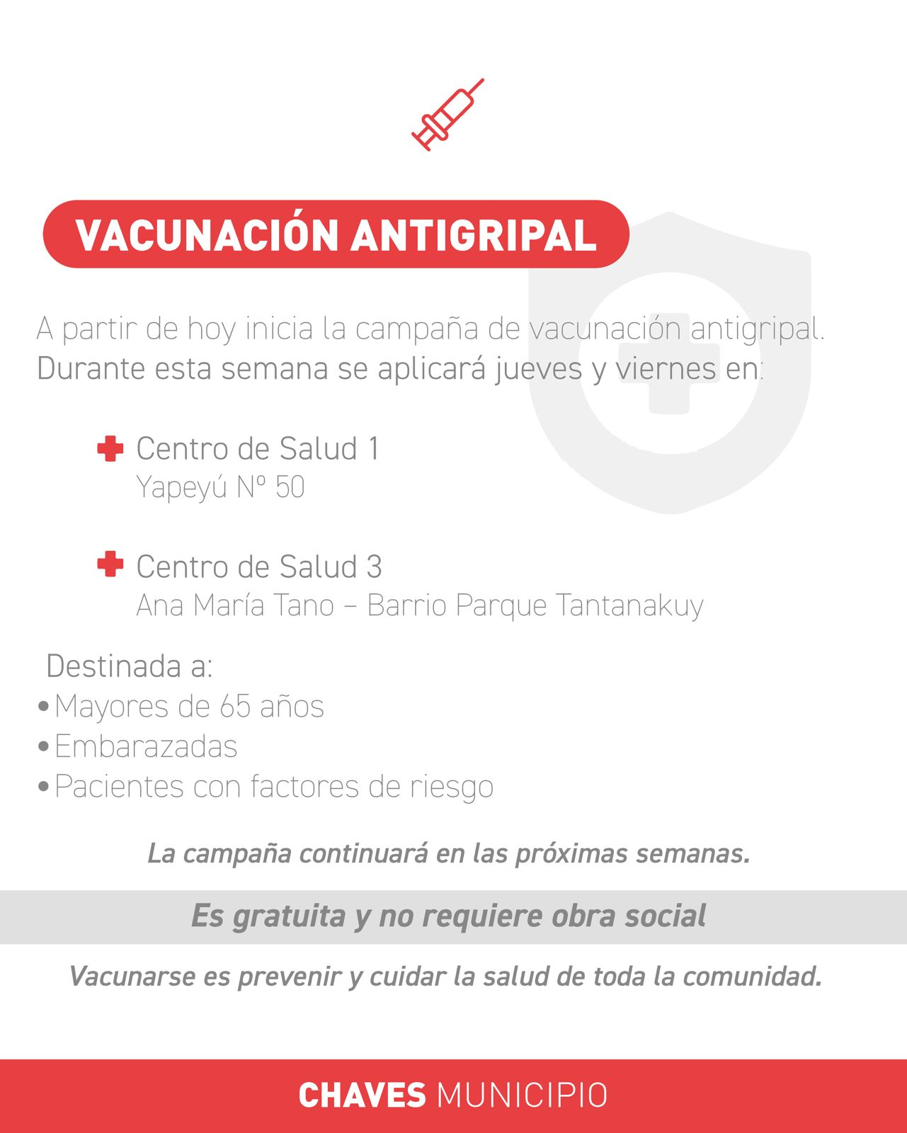 Desde la Secretaría de Salud se recuerda que la vacuna es gratuita y que no es necesario contar con obra social para acceder a la misma.