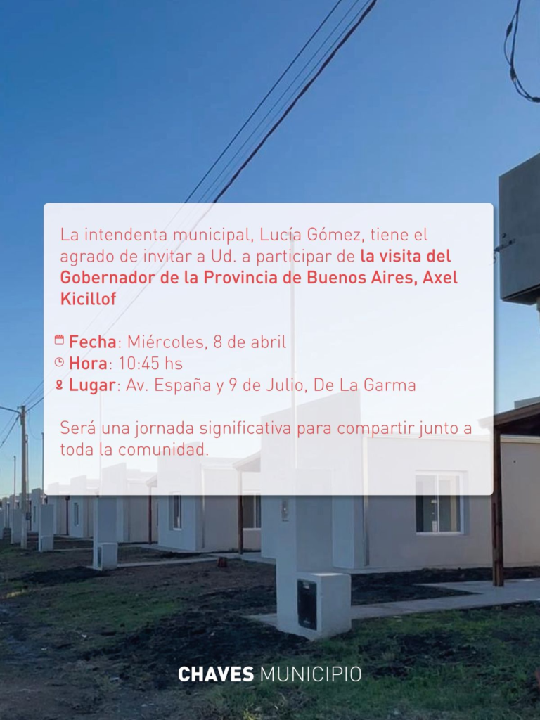 La intendenta de Adolfo Gonzales Chaves, Lucía Gómez, invita a instituciones, establecimientos educativos, organizaciones y a la comunidad en general a participar de la visita del gobernador de la provincia de Buenos Aires, Axel Kicillof, que se realizará el próximo miércoles 8 de abril a las 10:45 horas en la localidad de De La Garma.