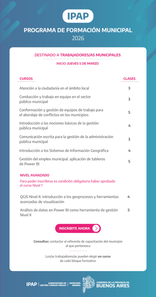 Programa de Formación Municipal. IPAP 2026 Feb 27,2026 Comentarios desactivados en Programa de Formación Municipal. IPAP 2026 Te invitamos a participar en nuestros cursos de Formación, que comenzarán en el mes de Marzo Aprovechá para seguir fortaleciendo tus competencias laborales. ¡No dejes pasar esta oportunidad de capacitarte!