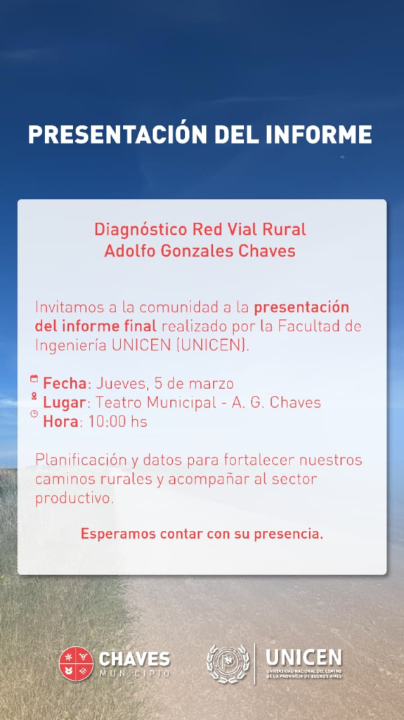 Chaves Municipio invita a la comunidad a participar de la presentación del informe final del “Diagnóstico de la Red Vial Rural”, realizado por la Facultad de Ingeniería de la Universidad Nacional del Centro de la Provincia de Buenos Aires (UNICEN).