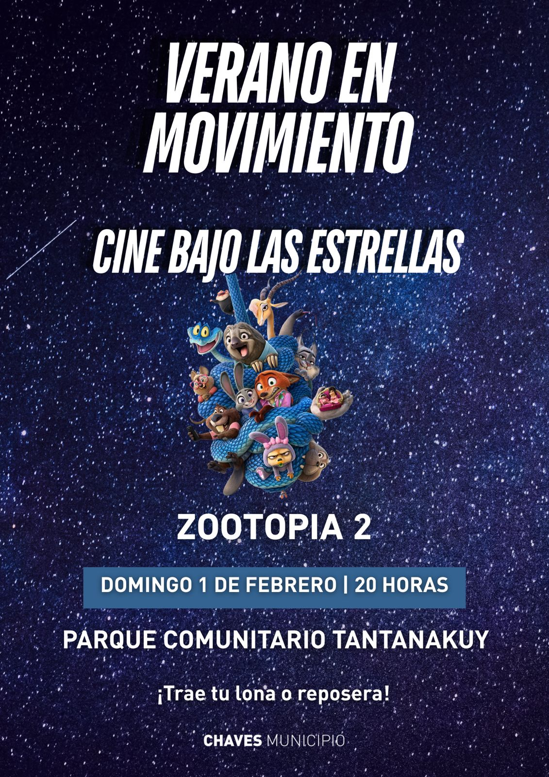 La propuesta continuará el domingo 1 de febrero, también desde las 20:00, en el Parque Tantanakuy, con una función especialmente pensada para el público infantil y familiar, con la proyección de Zootopia 2.