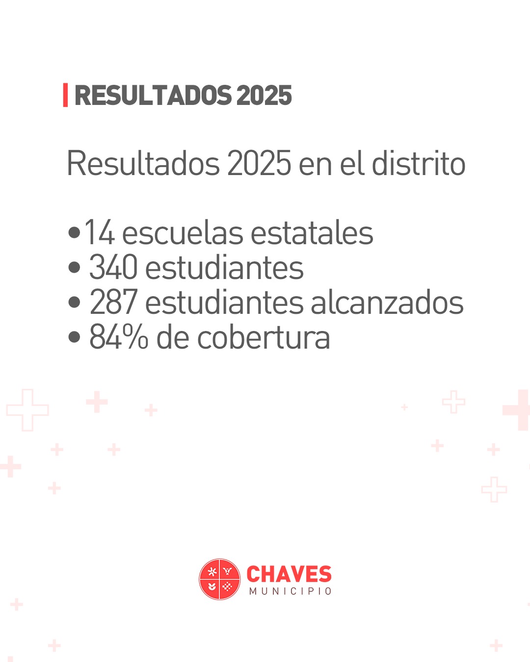 Durante su implementación en 2025, el programa alcanzó a 14 escuelas estatales del distrito, con un total de 340 estudiantes, de los cuales 287 fueron efectivamente alcanzados, logrando una cobertura del 84%.